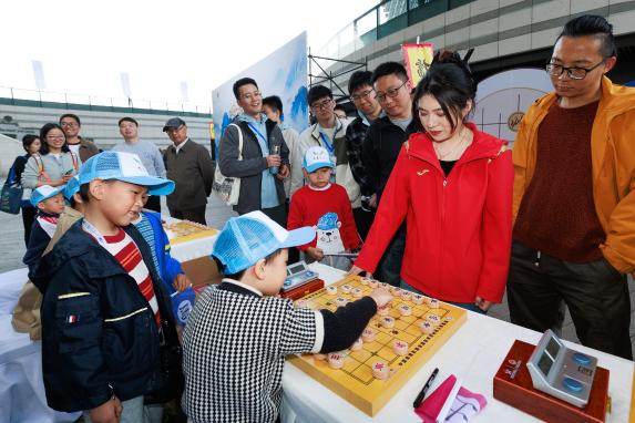 (象棋国家大师张婷婷和小棋手现场对弈)