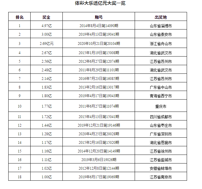 据统计,此次中出的2.69亿元大奖,是体彩大乐透今年中出的最大奖,目前排名第3位。此前,山东淄博诞生的4.97亿元大奖,为体彩大乐透史上中出的最高金额亿元大奖,也是体彩历史上的最大奖。
