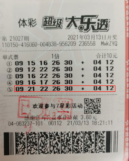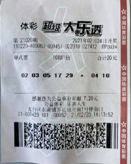 据了解,郑先生购买大乐透很多年,闲暇除了和朋友聚会,就是到体彩店购买几注大乐透碰碰运气。郑先生接触过体彩的各种游戏,偏爱大乐透。2月23日,郑先生外出九台办事,看到了路边的体彩店,习惯性走进去,打了一张票面20元金额的1注10期多期票。