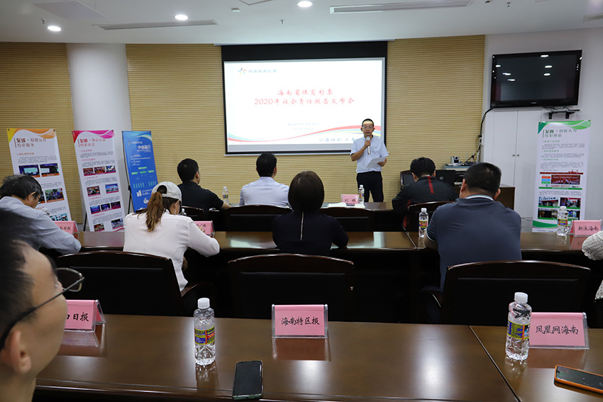 11月16日16时,国家体育总局与人民网联合举办的《2020年中国体育彩票(1+31)社会责任报告》新闻发布会在北京举行。本次发布会以“责任驱动 价值创造”为主题,活动现场系统呈现了中国体育彩票责任彩票建设成果。本次发布会中国体育彩票首次采用“1+31” 发布的形式,除发布中国体育彩票报告外,31个省(区、市)体彩中心的2020年度《社会责任报告》也在发布会现场集体亮相。当天,海南省体育彩票管理中心在海口也同步举行了发布会,正式对外发布了《2020年海南省体育彩票社会责任报告》(以下简称《报告》),海南本地的媒体记者、体彩从业人员代表参加了发布会。