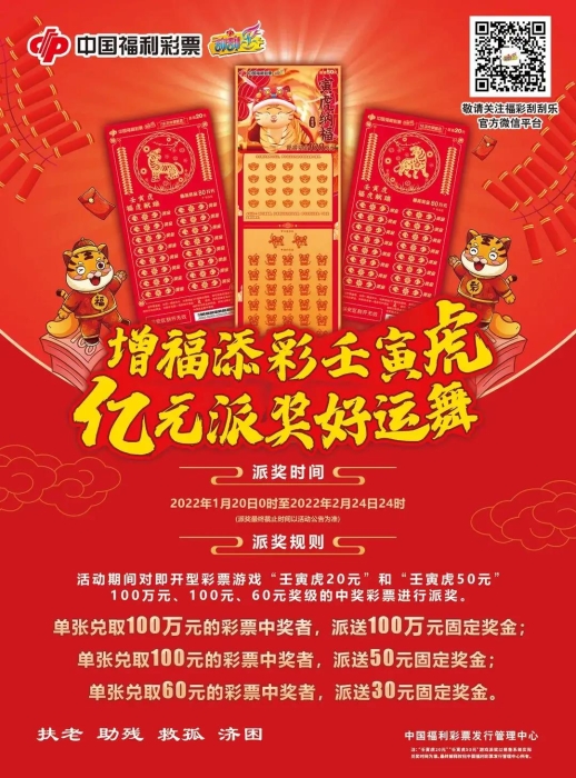 增福添彩壬寅虎,亿元派奖好运舞。为了回馈广大购彩者对即开型福利彩票的关心与支持,2022年1月20日至2月24日,中国福利彩票发行管理中心将对虎年生肖票“壬寅虎”游戏开展亿元派奖活动。
